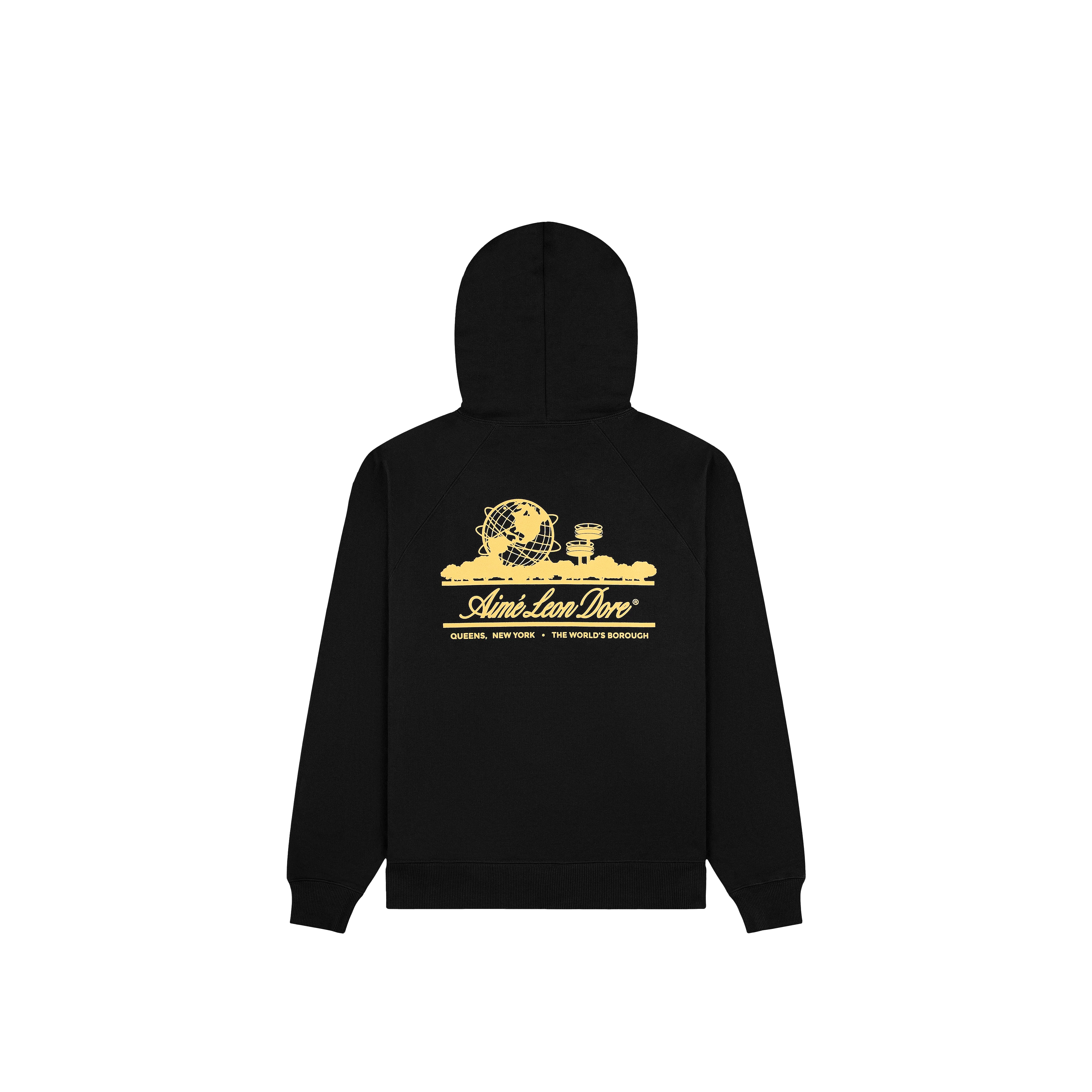 The Aimé Leon Dore (ALD) Black Unisphere Hoodie is a premium streetwear staple, typically featuring a heavy loopback fleece construction (100% cotton), a classic drop-shoulder fit, and the iconic Unisphere logo printed on the chest and/or back, nodding to Queens, NY heritage, with details like flat drawstrings, ribbed cuffs/hem, and a kangaroo pocket, offering both comfort and iconic branding for a relaxed, cultured look.