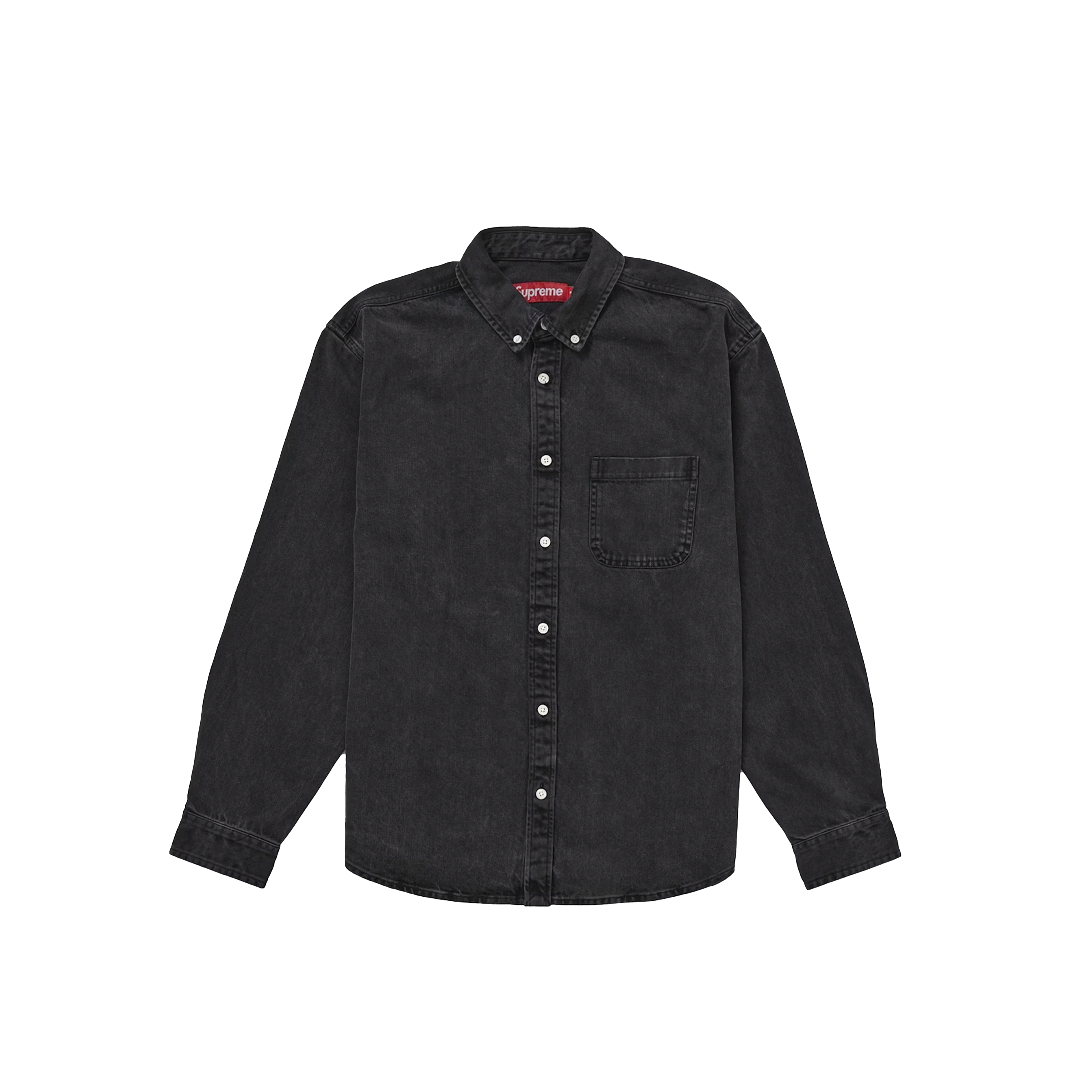 The Supreme Appliqué Denim Shirt in black (released FW21) is a 10 oz. all-cotton button-down shirt featuring a single chest pocket and a prominent logo appliqué on the back. Released on August 19, 2021, this streetwear piece combines classic denim styling with bold branding