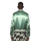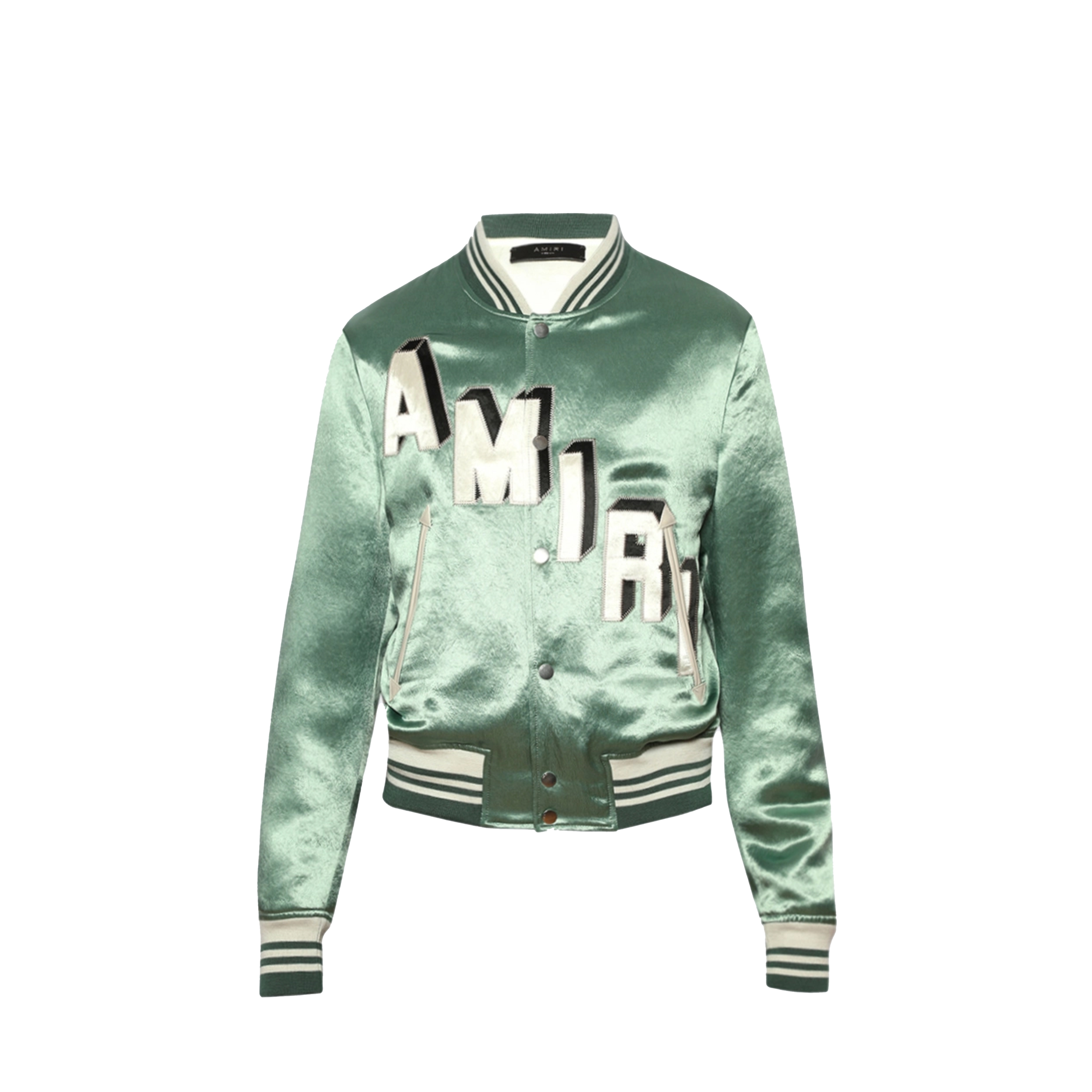 The AMIRI Logo-Embroidered Satin Varsity Jacket in Mint (AW23MOS091-350) is a luxury, cropped-style bomber jacket featuring a mint green acetate satin body, white leather sleeves, and contrasting white logo embroidery on the chest. Made in Italy, this, high-end piece features striped rib-knit trims, snap-button closure, and a viscose lining, blending classic varsity style with modern streetwear luxury