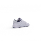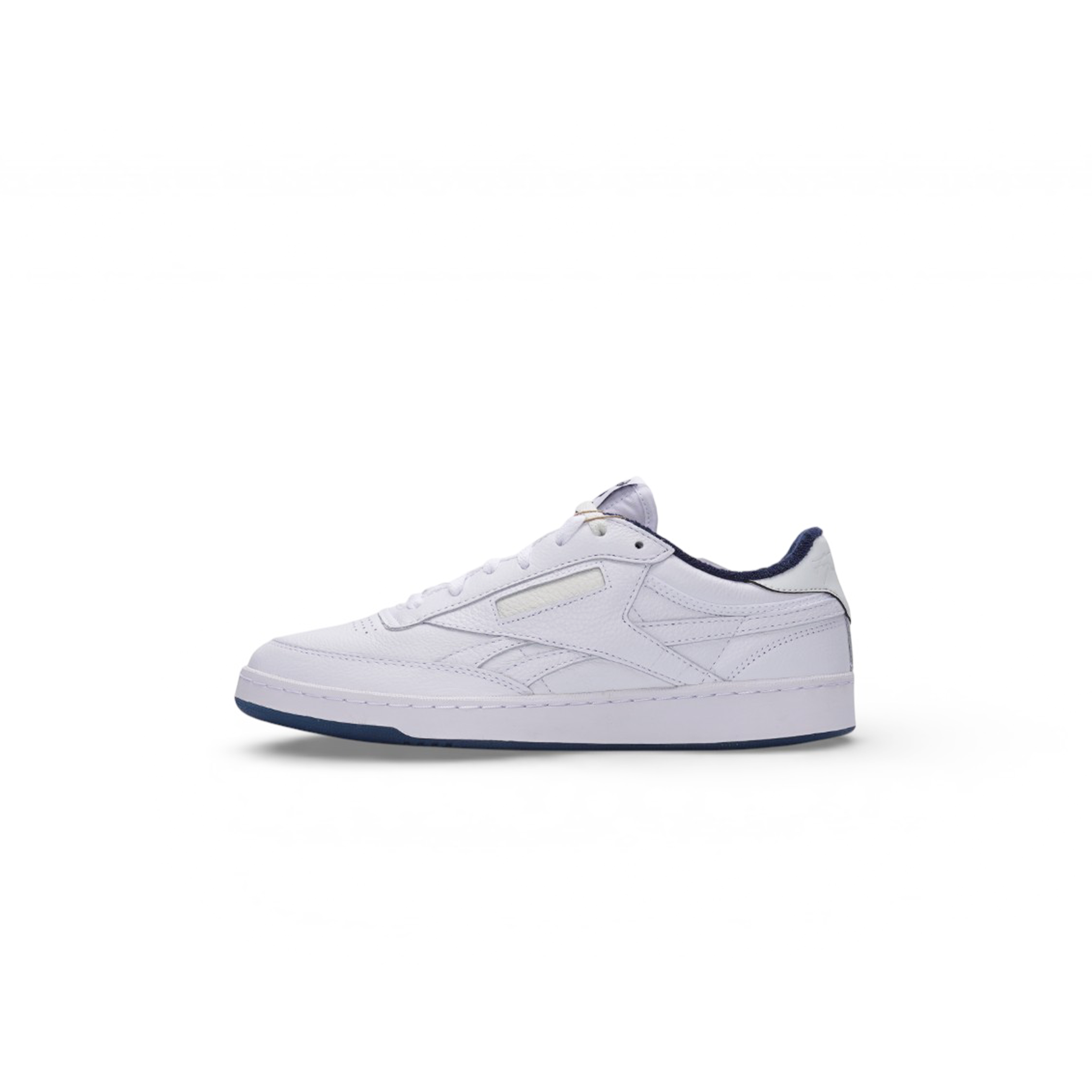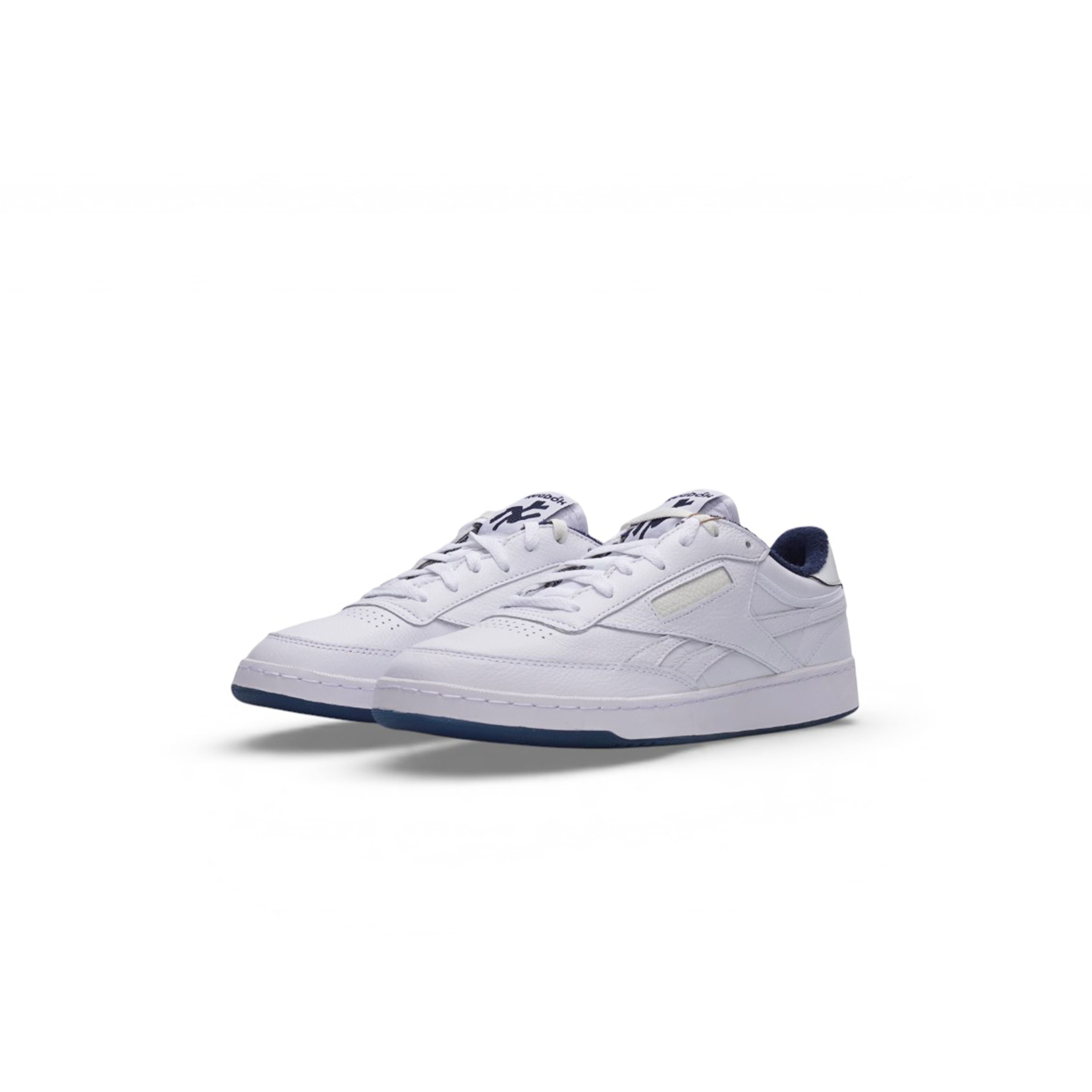 The Reebok Club C 85 Tyrrell Winston "Vector Navy" (Style 100069833) is a premium leather sneaker featuring a clean white base with subtle Vector Navy accents, inspired by artist Tyrrell Winston's minimalist aesthetic and New York Yankees motifs. Key details include a blank leather window on the side, a retro terry lining, reflective heel tab, and a signature blue-tinged translucent outsole revealing "1985" (Club C's birth year) on one shoe and Winston's signature on the other, offering premium materials and unique branding for a stylish, versatile look.