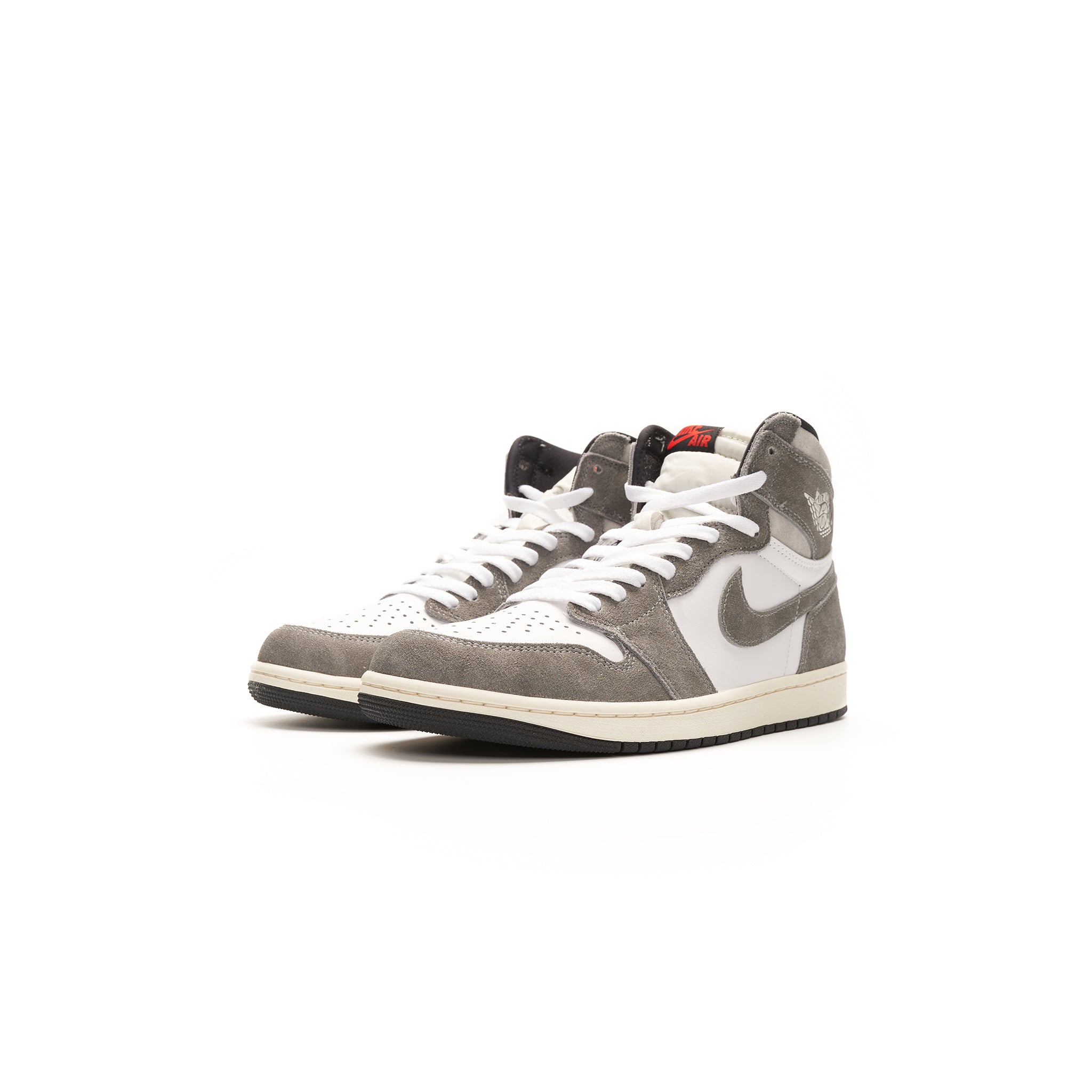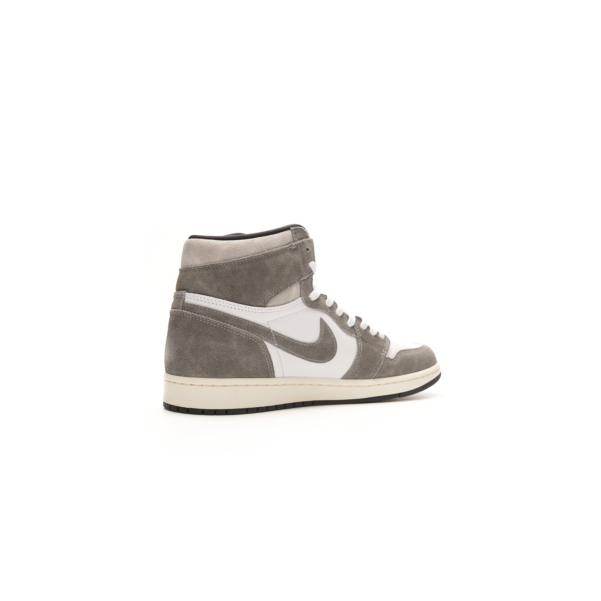 The Jordan 1 Retro High OG Washed Black is a limited edition sneaker from Jordan Brand, crafted with white leather, Washed Black uppers, and hints of grey around the collar. The aged look is completed with a sail colored midsole, white laces, and a white Air Jordan Wings logo.